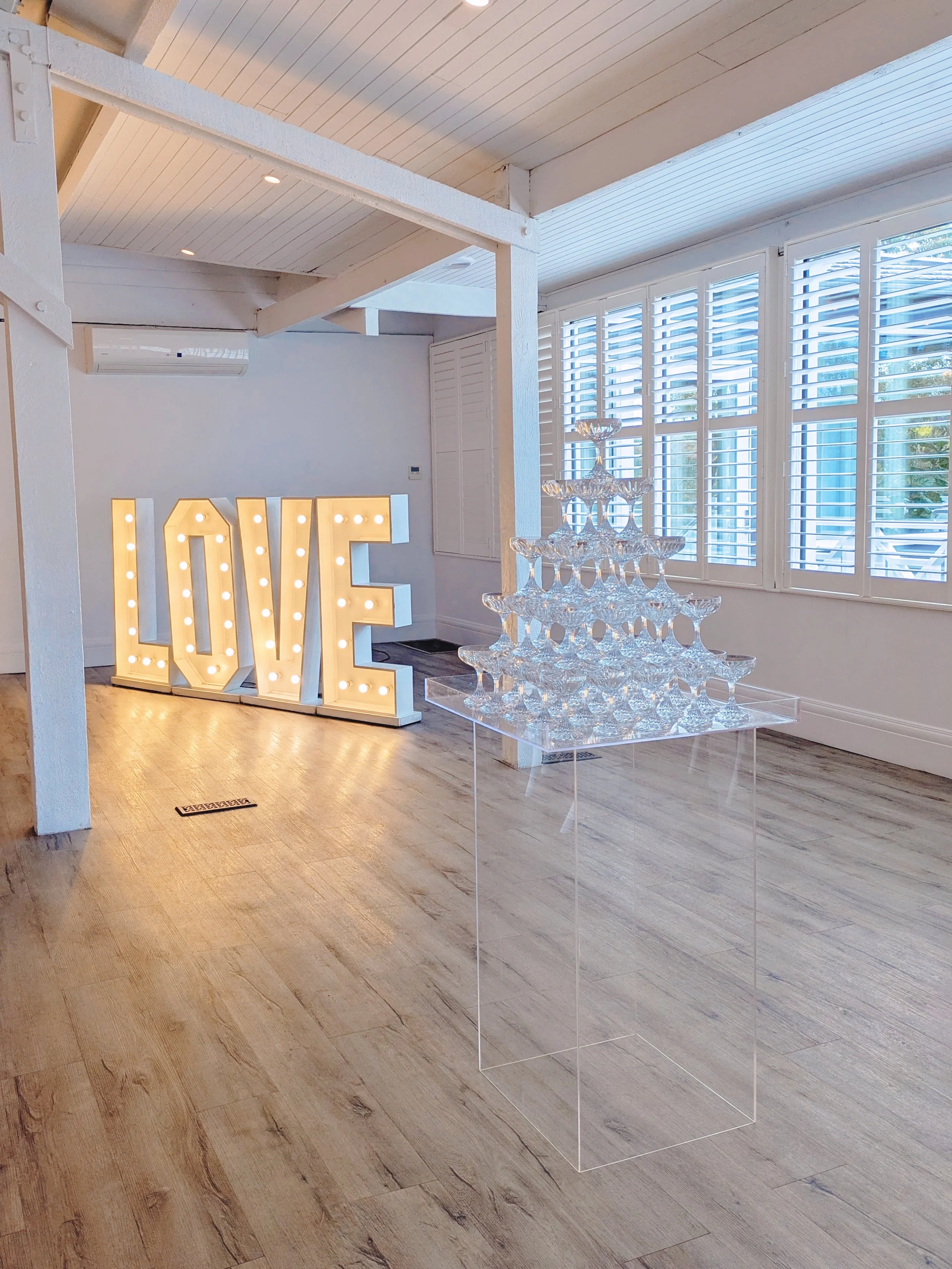 A 5-tier champagne tower requires 8–10 bottles for a full pour or 5 bottles for a partial pour. (Champagne not included in hire)