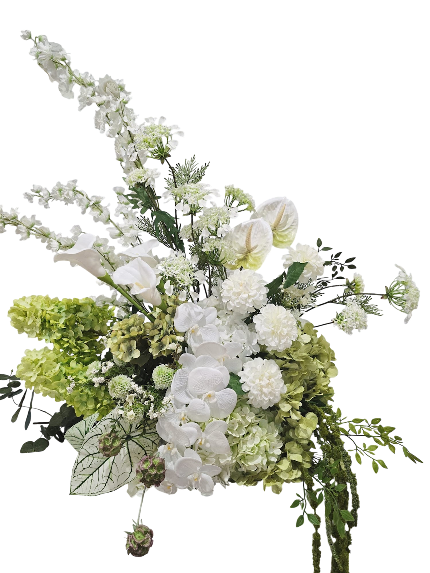 This artificial floral theme is a modern design with a focus on green and white hydrangeas, offering a fresh and modern twist on traditional classic greenery.